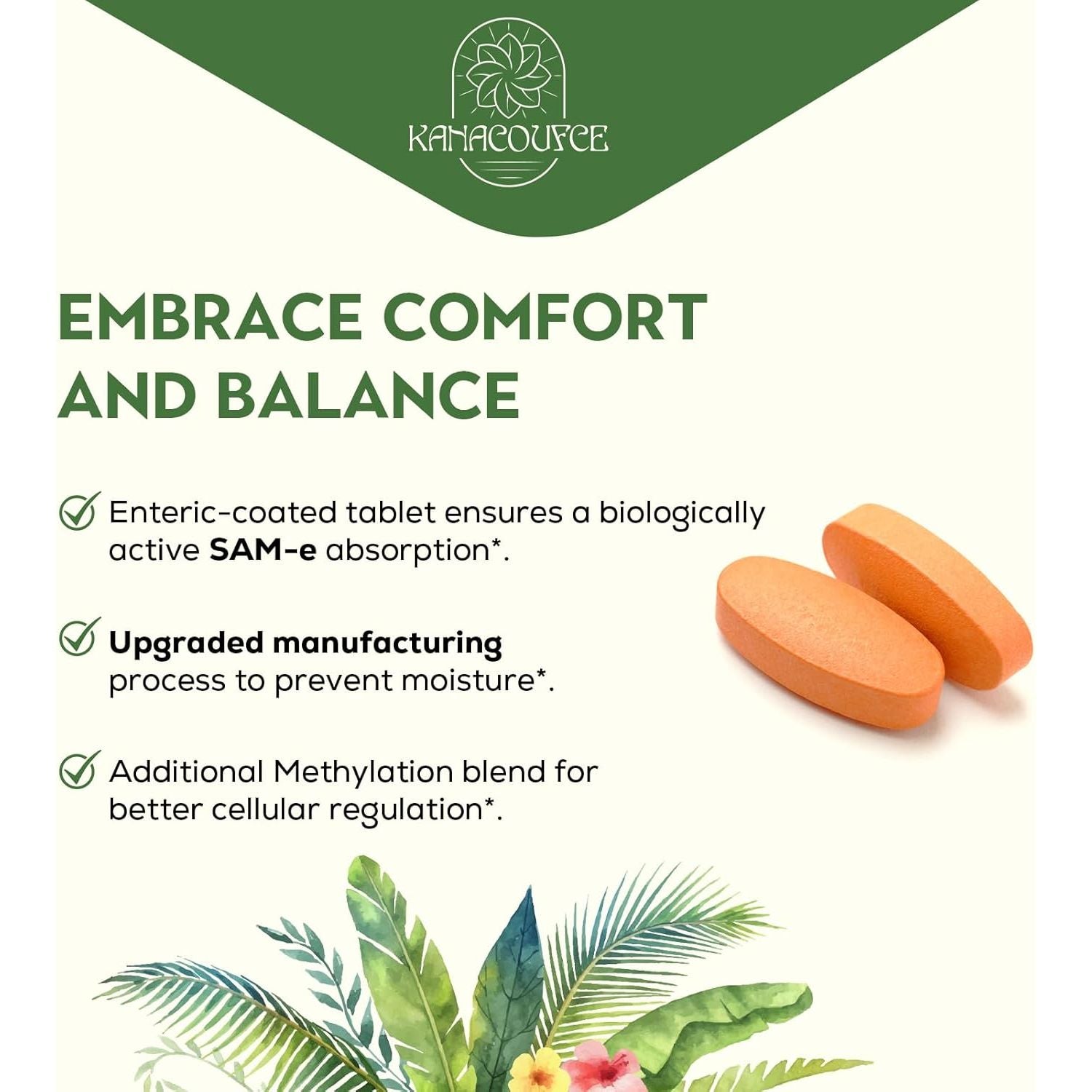 - Trusted Quality: Kanaeoufce enteric-coated tablets ensure gentle and optimal absorption. 60 tablets per bottle, enough for a full 2 months' supply, enjoy the 1100mg SAM-e without interruption. Made in the USA, GMP certified, Non-GMO, Gluten Free, Vegan