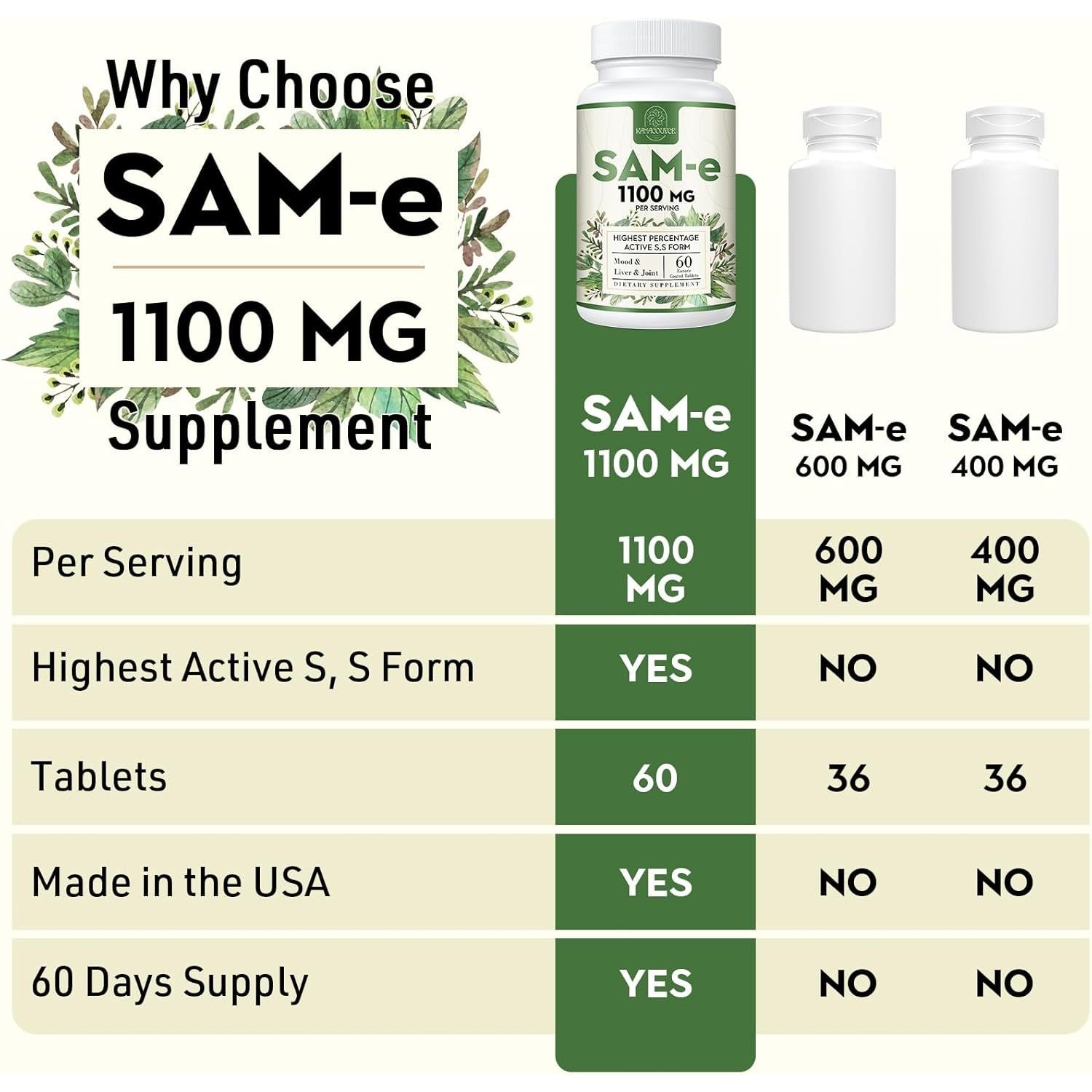 - Embrace Comfort and Balance: 1100mg SAM e supplements can balance daily hormones & emotions and reduce fatigue. Experience improved focus, clarity, and agility in your thinking, empowering you to tackle daily tasks with ease and precision