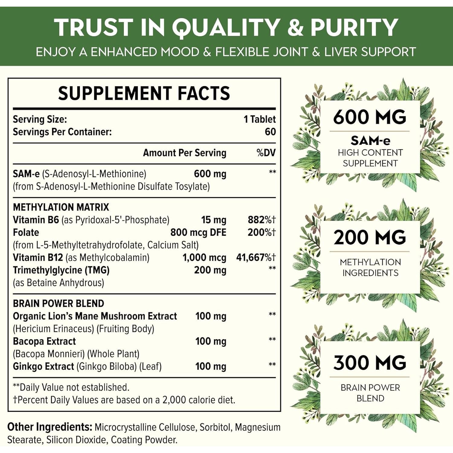 1100Mg Sam-E (S-Adenosyl-L-Methionine), SAM E Supplement for Mood, Joint & Liver 60 Tablets