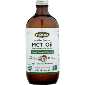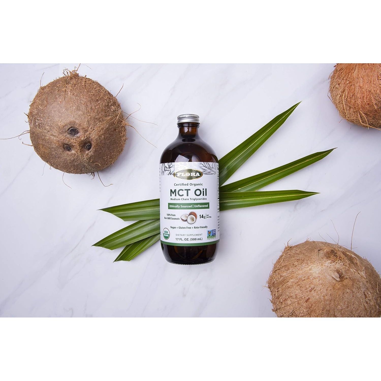 Flora Health MCT Oil Organic Energy Boost, C8 Caprylic & C10 Capric Acids,17 Fl Oz Liquid, Glass Bottle