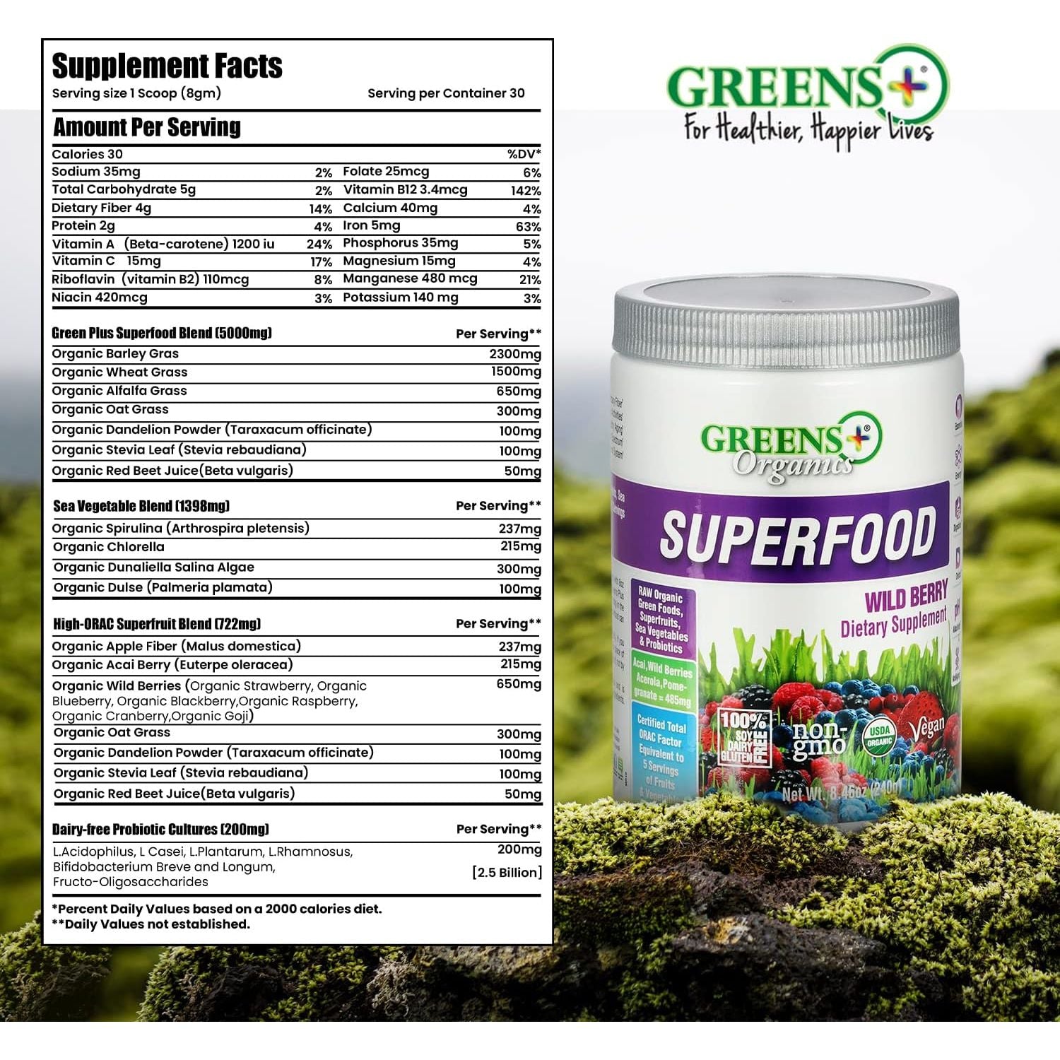 Greens+ Organic Wild Berry Superfood Powde is a mix of organic ingredients for your daily nutrition.It is rich in fruits, vegetables, and greens packed with antioxidants to help energize and promote overall vitality. Its role in healthy digestion, natural energy production, and balanced nutrition makes it an ideal addition to daily habits. Wild Berry Flavor SuperfoodPea + Brown Rice Protein.
