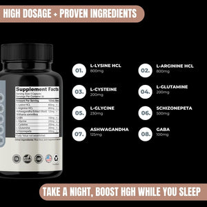 - Experience the power of HGH Boost, your personal elixir to naturally boost your HGH levels while you sleep. This remarkable supplement is your key to anti-aging, heightened stamina, improved strength and muscle, and boundless energy. With a potent blend of rejuvenating ingredients, including L-Lysine HCL, L-Arginine HCL, Ashwagandha, GABA, L-Glycine, L-Cysteine, L-Glutamine, and Schizonepeta, you can experience faster workout recovery, youthful skin, vibrant hair and improved muscle tone.