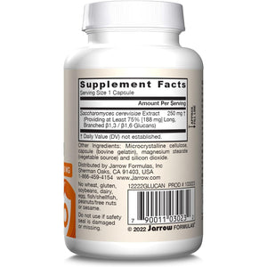 Jarrow Formulas® Beta Glucan Yeast Extract supports the immune system and immune health.(1) These supplements provide 250 mg of Saccharomyces cerevisiae extract per serving, which are natural bioactive carbohydrates, with those derived from certain yeasts and fungi being known for their ability to support the immune system.(1) Jarrow Formulas® Beta Glucan is a high purity extract from the cell walls of a proprietary Baker’s yeast strain with a unique molecular structure.(1) This dietary supplement is non-GMO and is gluten-free. Adults take one capsule once a day on an empty stomach with a full glass of water or as directed by your qualified healthcare professional. Jarrow Formulas® – Superior Science. Smarter Formulas.®(1)These statements have not been evaluated by the Food and Drug Administration. This product is not intended to diagnose, treat, cure or prevent any disease.