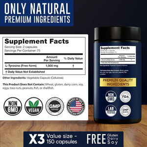 L Tyrosine 1000MG Capsules - All-Natural L- Tyrosine Supplement for Focus & Energy Boost 150 Caps -500MG