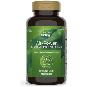 Nature's Way Air-Power Guaifenesin Expectorant is a natural respiratory support supplement designed to help clear the respiratory airways and thin and loosen mucus. Packed with guaifenesin, a proven active ingredient that works with your body to break apart and expel mucus*, promoting easier breathing comfort, this 100-tablet bottle is a must-have. Air-Power is perfect if you want to clear your respiratory system or follow up on mucus removal while easing discomfort.
