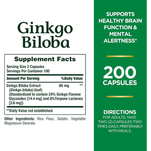 Nature's Bounty Ginkgo Biloba: A high-quality herbal supplement that supports healthy brain function and mental clarity. Each capsule has 60mg of Ginkgo Biloba, one of the most popular herbs for general wellness, used for centuries. It is a natural way to support brain health and mental fitness. It comes with 200 capsules per bottle, a generous supply to ensure you start your day each day right.