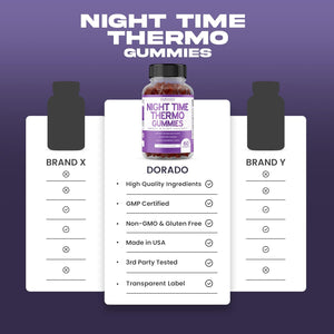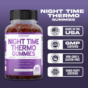 - NIGHT FAT BURNER GUMMIES: Support your well-being with our Night Time Thermo Gummies, helping you wake up refreshed and ready to take on your day. Our blend of natural ingredients promotes restful sleep and may support your fitness goals.