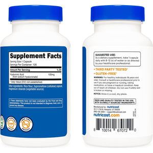 Nutricost Hyaluronic Acid Capsules for Healthy Joints and Skin Are Ultra-Pure, non-GMO, Gluten-Free, and Third-Party Tested.