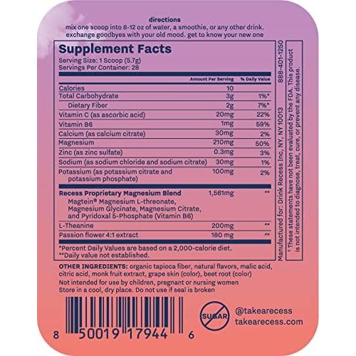 Instructions: Add 8–12 oz of water to 1 full scoop of Recess Mood Powder. Mix well and enjoy daily, as needed, for a refreshing, calming drink.