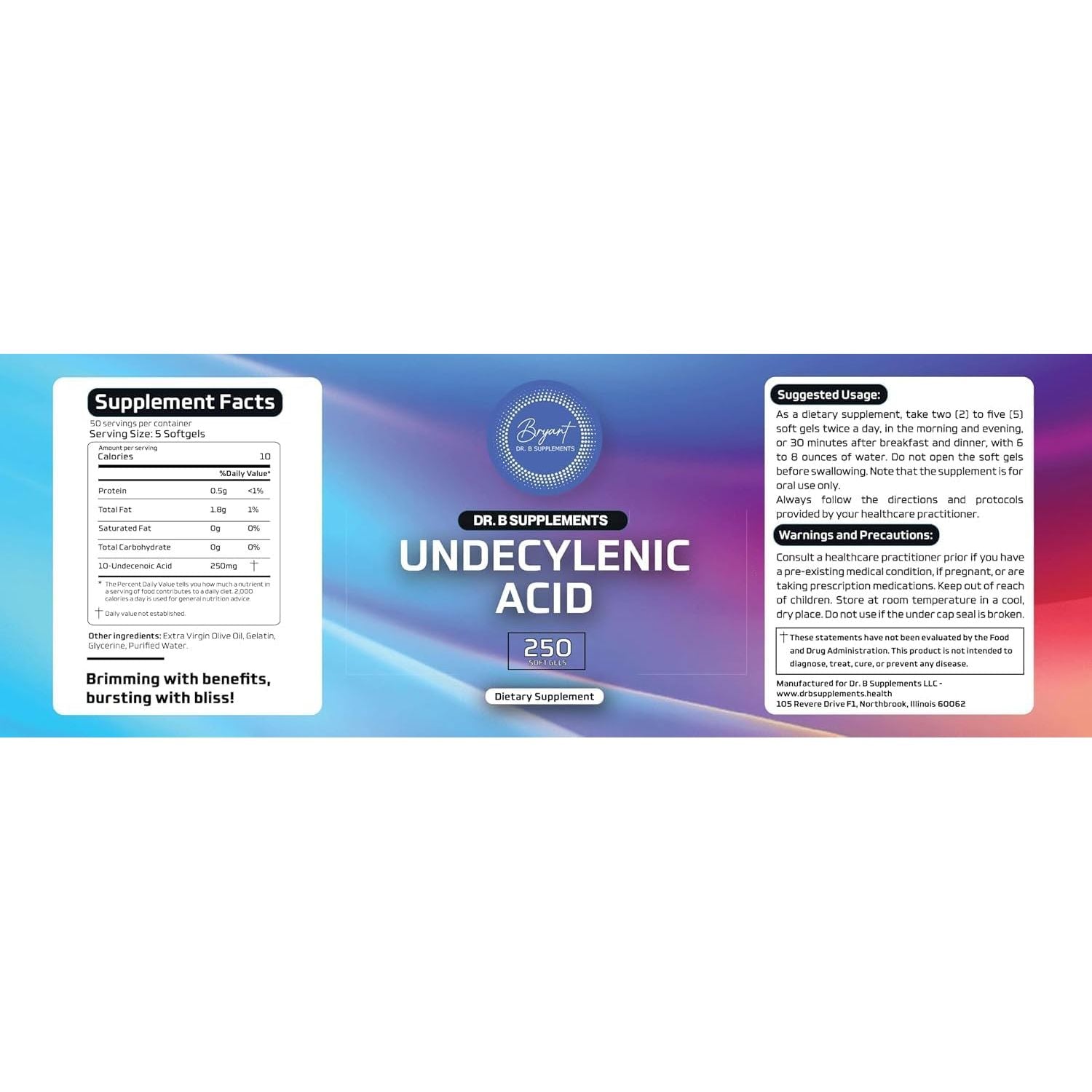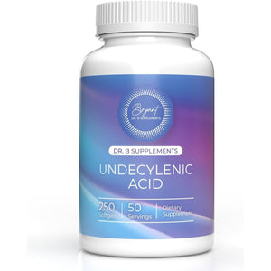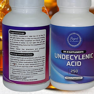 Gut Barrier: Your gut is not limited to your stomach, it encompasses your entire digestive tract, a complex mix of organs, hormones, enzymes, and microbes. The way these different components interact directly affects how effectively your body absorbs the nutrients from the food you consume. Therefore, any problems with your gut can have a significant impact on your overall health and well-being* We must take necessary measures to ensure optimal absorption of nutrients from what we eat, particularly if we are susceptible to digestive problems such as gas, bloating, acid reflux, constipation, or other discomfort after eating* Overall Wellness: The gastrointestinal tract must function optimally to absorb nutrients, synthesize nutrients, produce short-chain fatty acids for colon health, eliminate waste, and proper immune function. An unhealthy diet, insufficient digestive enzymes, and using different types of medications can cause imbalances in the gut flora. For this reason, it's important to take supplements to support a healthy gut. Dr B Supplements provides well-researched, high-quality supplements that support a healthy gut* NOTE: Purest Ingredients: Docter Bryant is committed to providing high-quality supplements that contain research-backed ingredients in efficacious amounts and retain potency until expiration. Dr. B Supplements Undecylenic Acid. Formulated with a potent, pure form of undecylenic acid. It is 6X stronger than caprylic acid. (Manufactured in the U.S.) Fatty Acids: Dr. Bryant's undecylenic acid, which is the most potent form of fatty acid is proven by scientific studies that it could maintain a healthy balance of gastrointestinal and vaginal flora effectively*