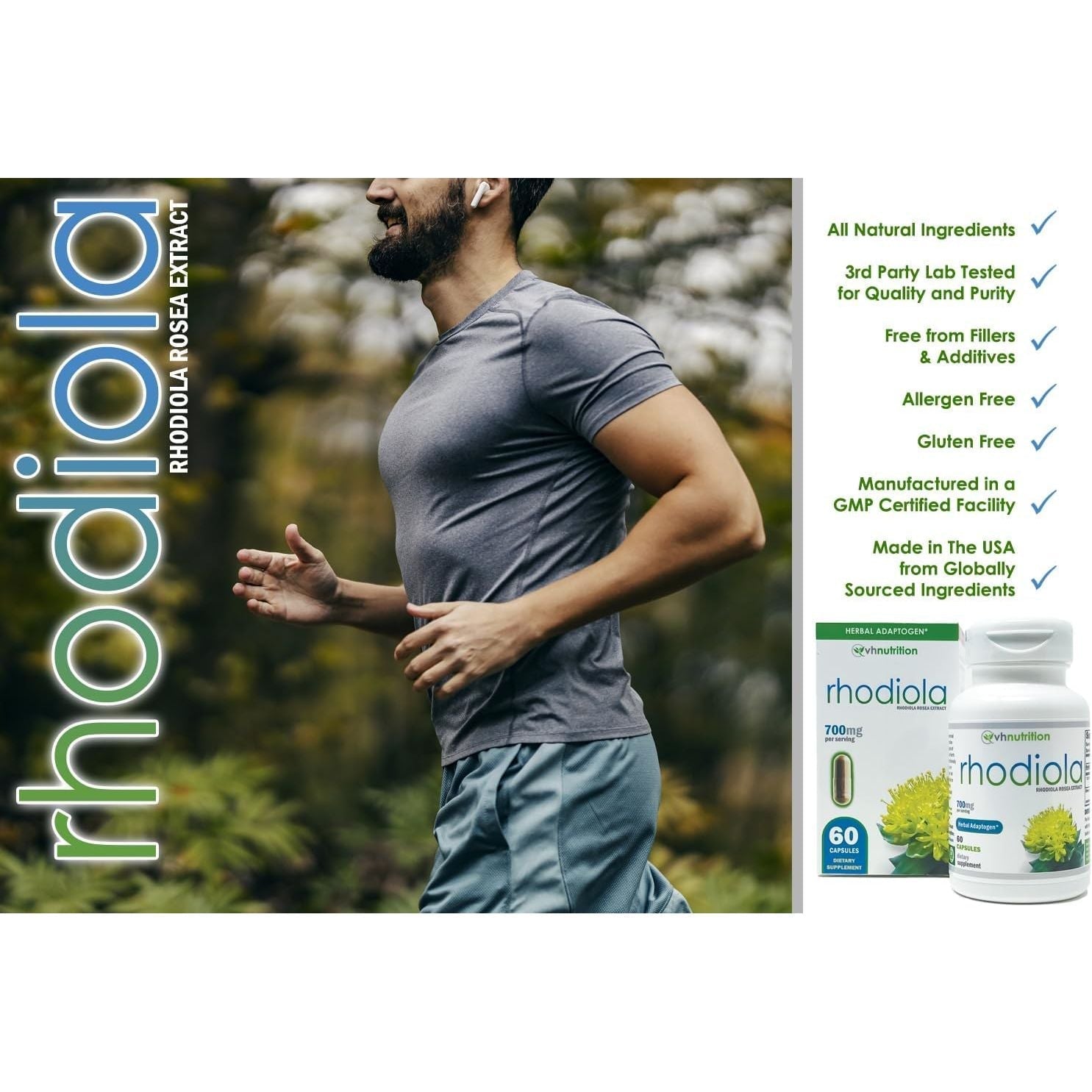 VH Nutrition RHODIOLA | Rhodiola Rosea Supplement | 3% Salidrosides Standardized Extract | 60 Easy-to-Swallow Capsules
